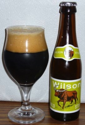 Wilson Mild Stout. Til tross for sitt engelske navn er Wilson Mild Stout belgisk, brygget hos Van Steenberge. Siden den kommer i en uskyldig liten 25 cl flaske, løper du ingen stor risiko ved å prøve den! Under 1. verdenskrig fikk belgierne i de frigjorte områdene sans for gamle britiske øltyper (som dengang var søtere enn de fleste er i dag), og Wilson har sin bakgrunn i denne tradisjonen. Øltypen "sweet stout" som den tilhører var i sin tid vesentlig mer populær i Europa enn den er nå, men fortsatt er der mange briter og belgiere som kjøper en sweet stout og en "dry stout" (som Guinness, Beamish, Murphys e.l.) samtidig, og blander dem i glasset. Det vil vi også anbefale, men dere som er veldig glade i det søte drikker selvfølgelig Wilson som den er! Ølet er kullsvart på fargen, med et kremet brunt skum. Deilig sterk og søt aroma av karamell / karamellsaus, røstet malt, melasse, bakeri og sjokolade.