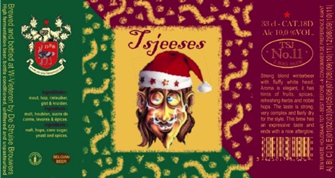 Fra Struise Brouwers i Belgia kommer Tsjeeses, en sterk og relativt lys ale ("triple" og vel så det) i den belgiske klosterølstilen. Etiketten har en tegning av en langhåret mann som man kunne mistenke for å ha bursdag rundt den 25. desember - for anledningen er han iført nisselue. Dermed er det vel også antydet hvilken årstid ølet primært er brygget for, men i suveren forakt for alle tåpelige regler om når gode øl "skal" drikkes, så lanserer vi det selvfølgelig på Cardinal i mars! Navnet er ellers hentet fra bryggeren Urbains faste vokabular - hver gang han smaker på et nytt brygg som han er fornøyd med (og det er ofte!) utbryter han: "Tsjeeses! For et øl!". Ja, man skal være stolt av sine egne produkter, særlig når de er så gode som dette.